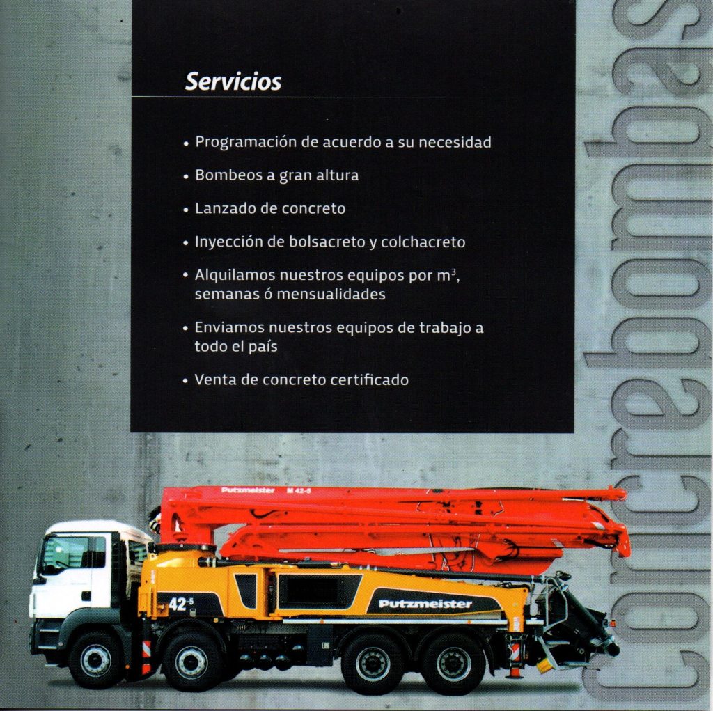 Ofrecemos servicios de bombeo de concreto a gran altura, inyección de Bolsacreto y Colchacreto, con Bomba Estcionaria o Autobomba, proporcionamos equipos de bombeos fijos en en obra por mensualidad o m3.